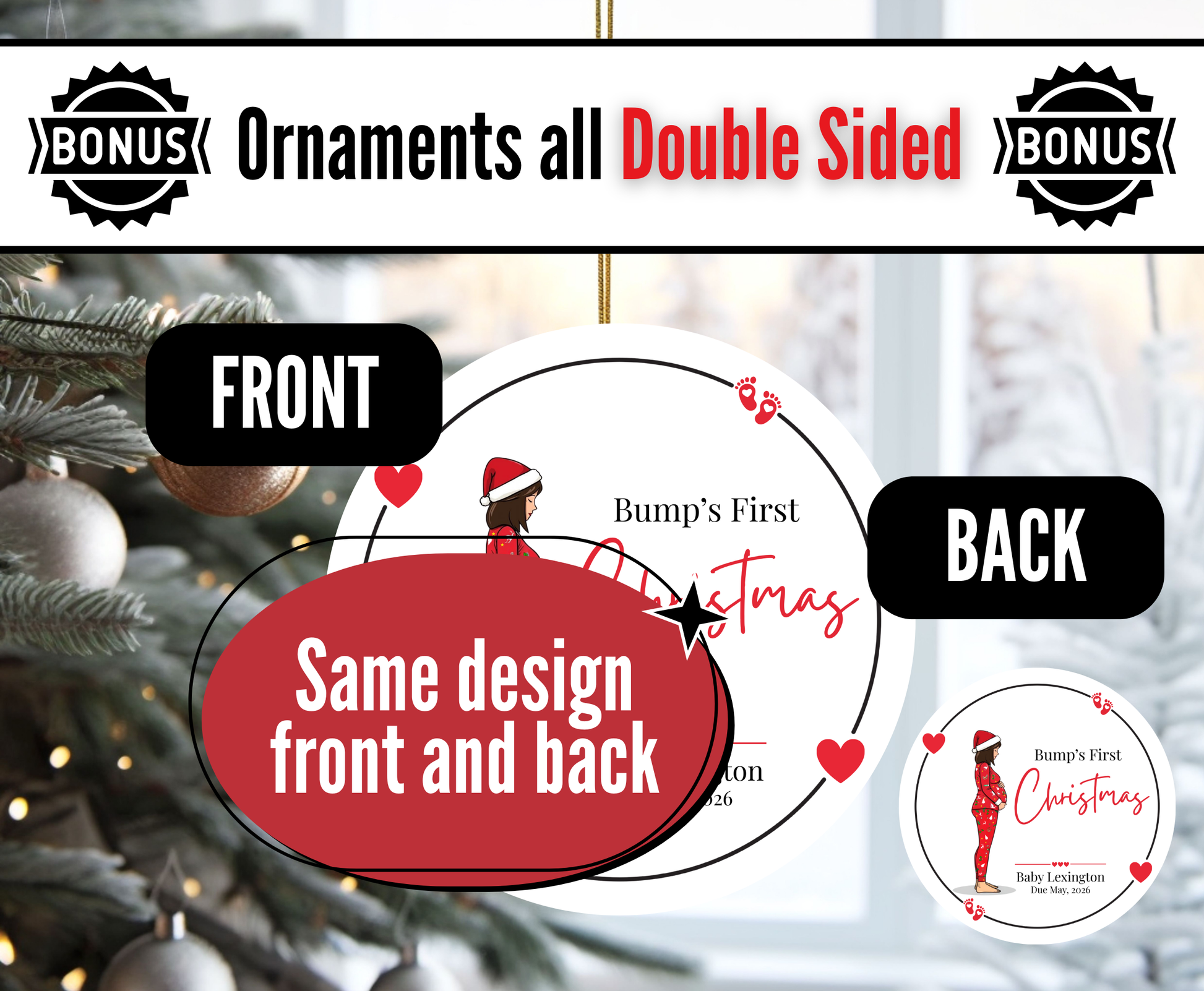 Baby bump ornament. Customize name and due date. The pregnant lady can be created using AI - hair colour and length can be changed easily.